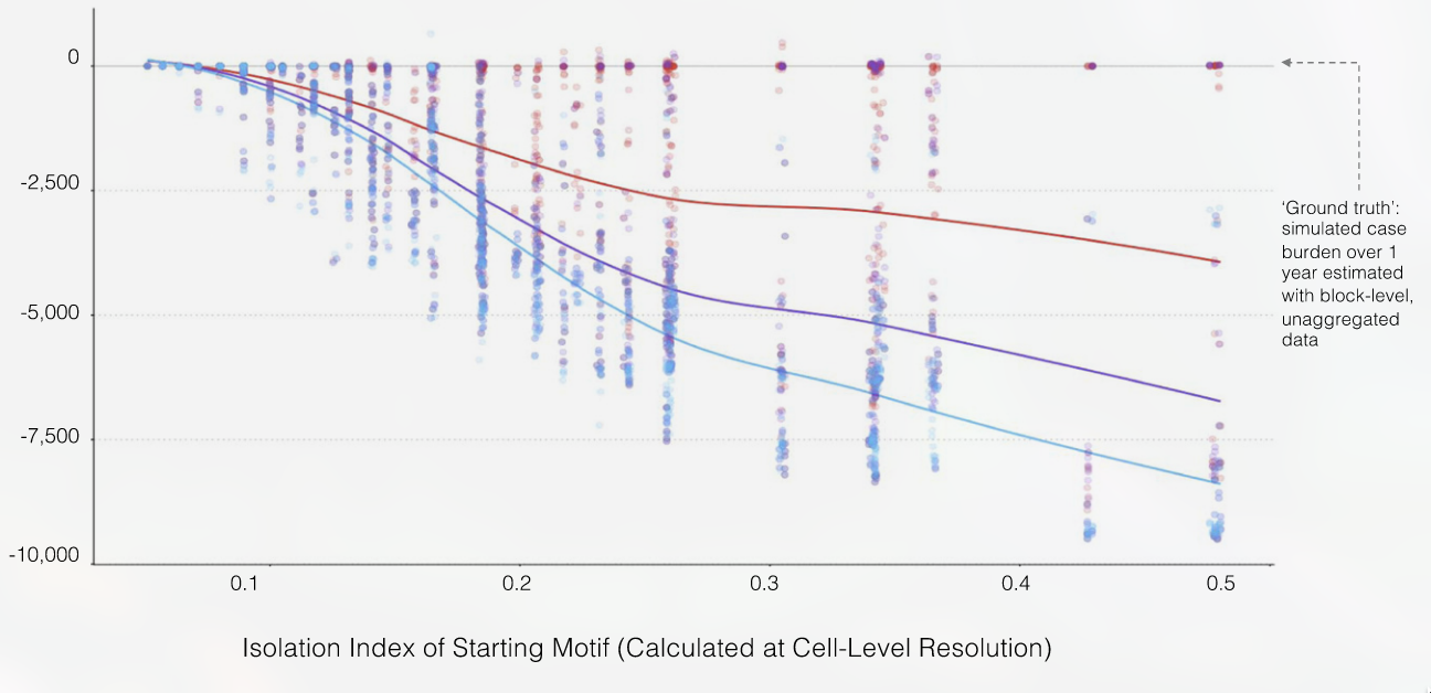 Predictions of outbreak size get worse as spatial aggregation becomes more extreme (from Masters et al. (2020))