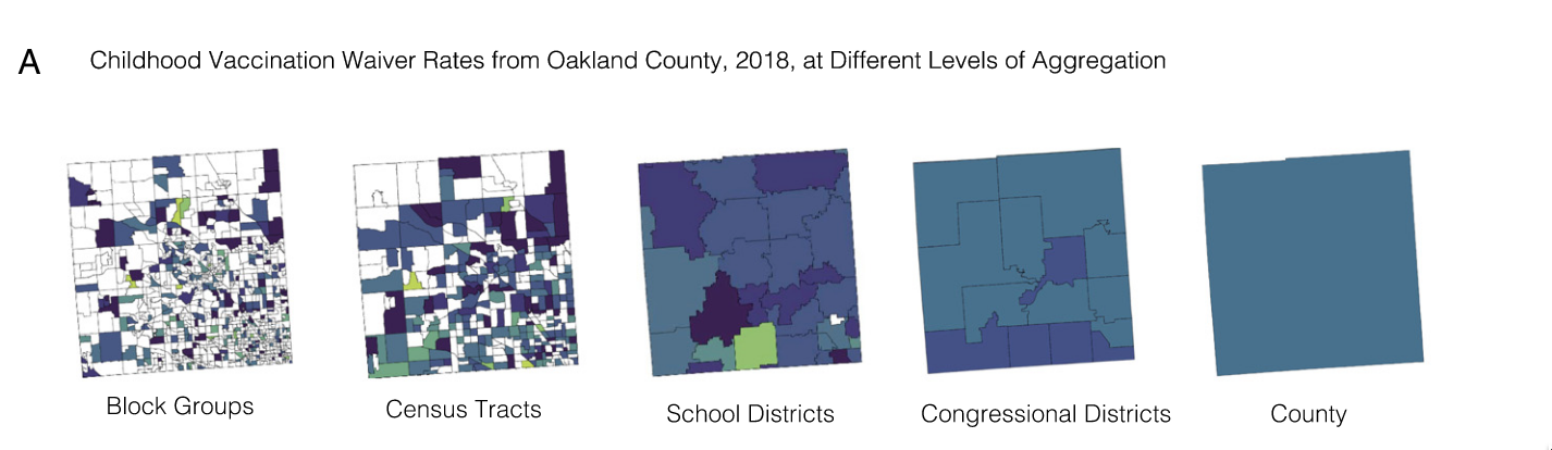 Aggregating across spatial scales obscures clustering of non-vaccination that leads to VPD outbreak risk (from Masters et al. (2020))