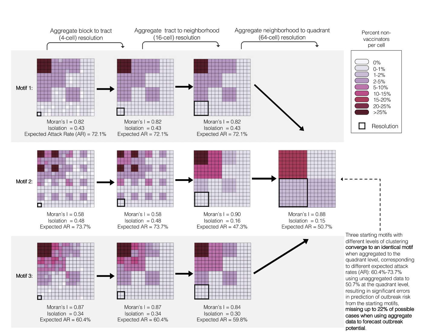 Aggregating up from low- to high-level spatial units results in biased estimates of measles outbreak risk.(1)