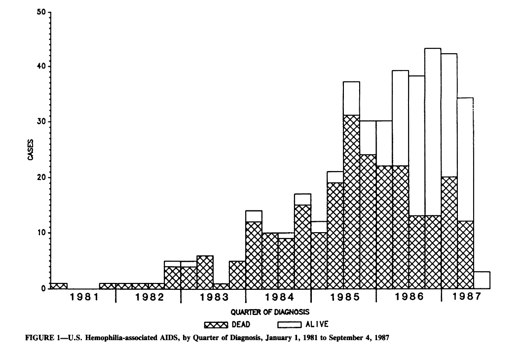 What does the number of cases among hemophilia patients over this period reflect? (Figure from from (Stehr-Green et al. 1988))