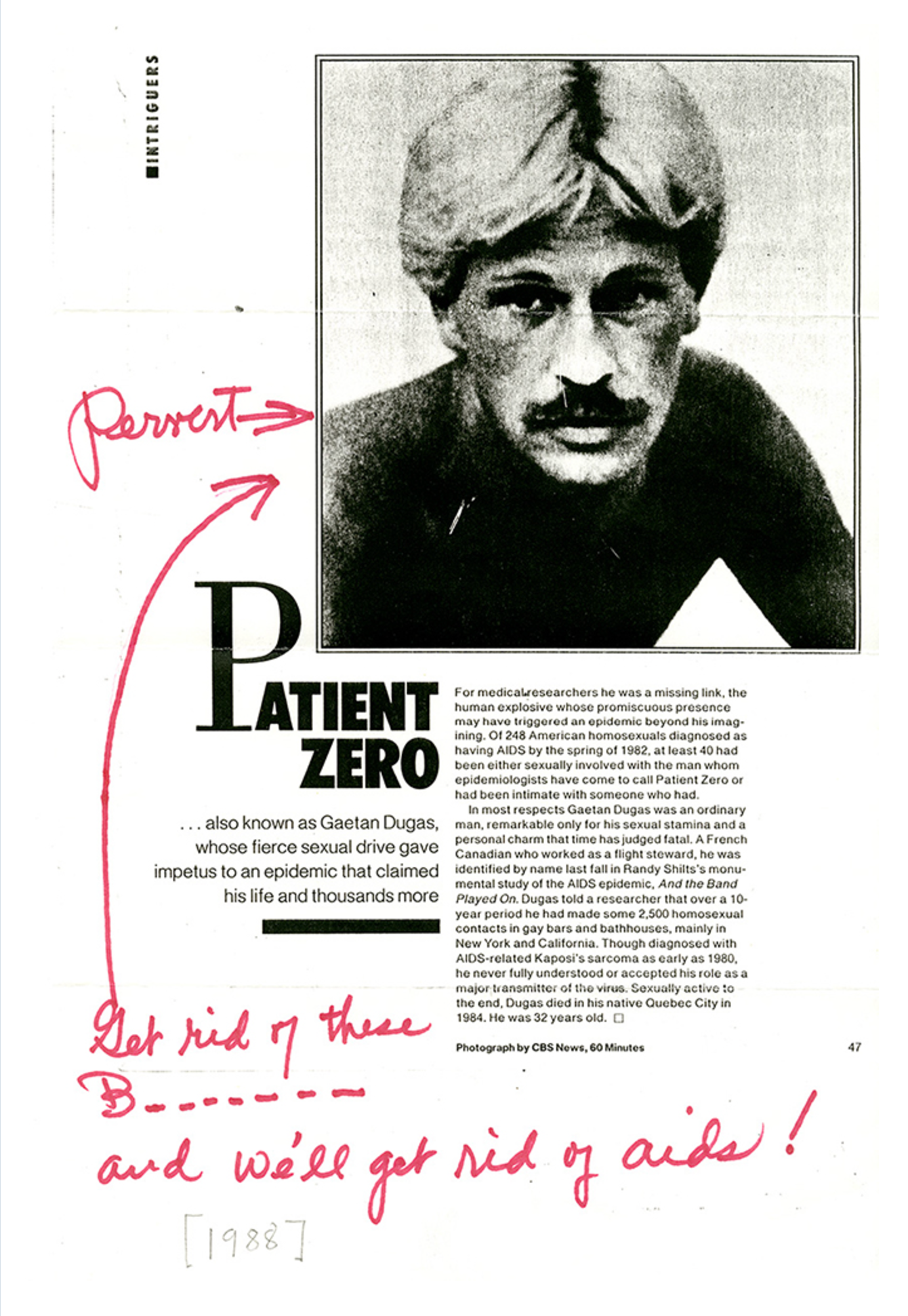 His hunch was accurate: the New York Post’s headline on October 6, 1987, epitomized the media’s response and characterized the popular memory of Gaétan Dugas from that point on. “the man who gave us aids” read the front page, claiming that Dugas “triggered ‘gay cancer’ epidemic in U.S.” Other publications drew upon the frequently rehearsed narrative of a disease introduced from abroad by a foreigner. “Canadian Said to Have Had Key Role in Spread of AIDS,” wrote the New York Times, while the National Review nicknamed Dugas “the Columbus of AIDS.” (McKay 2014)