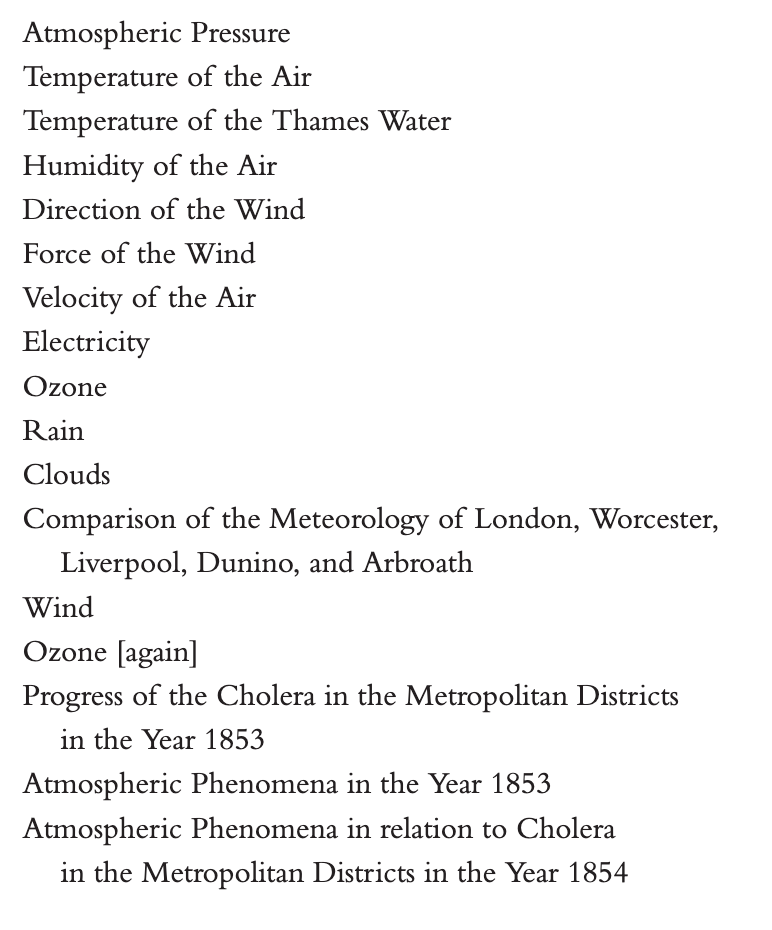 “If the symptoms of the cholera concentrated around the small intestine, then there must be some telltale characteristic in the eating and drinking habits of cholera victims. If cholera was waterborne, then the patterns of infection must correlate with the patterns of water distribution in London’s neighborhoods.” (p. 148)